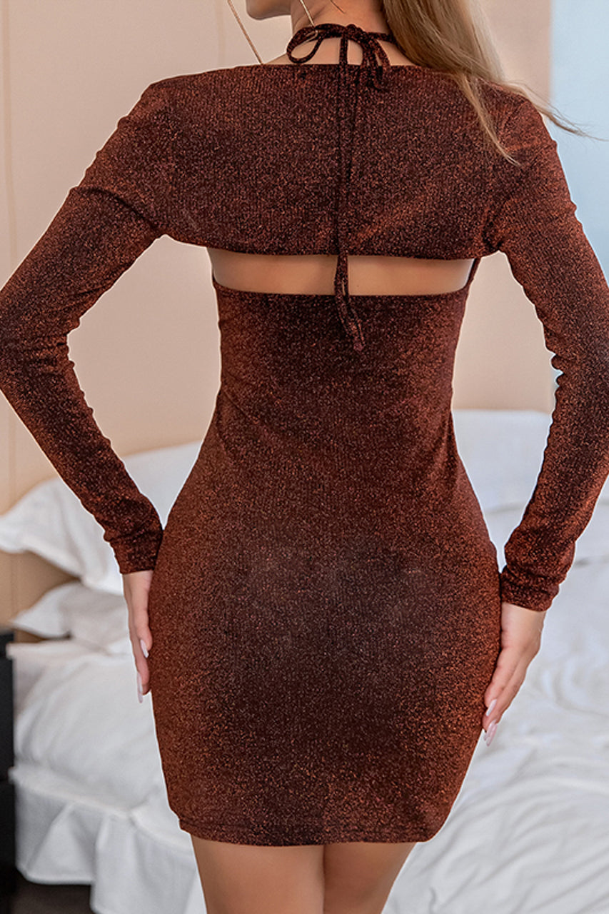 La robe bronze scintillante avec shrug assorti apporte une allure captivante et un jeu de reflets unique lors de vos sorties.