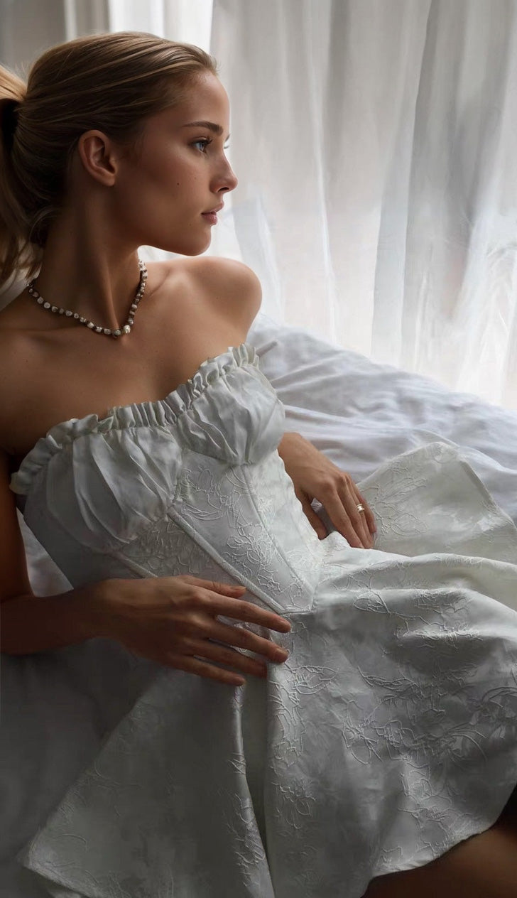 La robe micro mini corset jacquard combine une silhouette strapless avec un corset structuré pour un maintien optimal et un style affirmé.