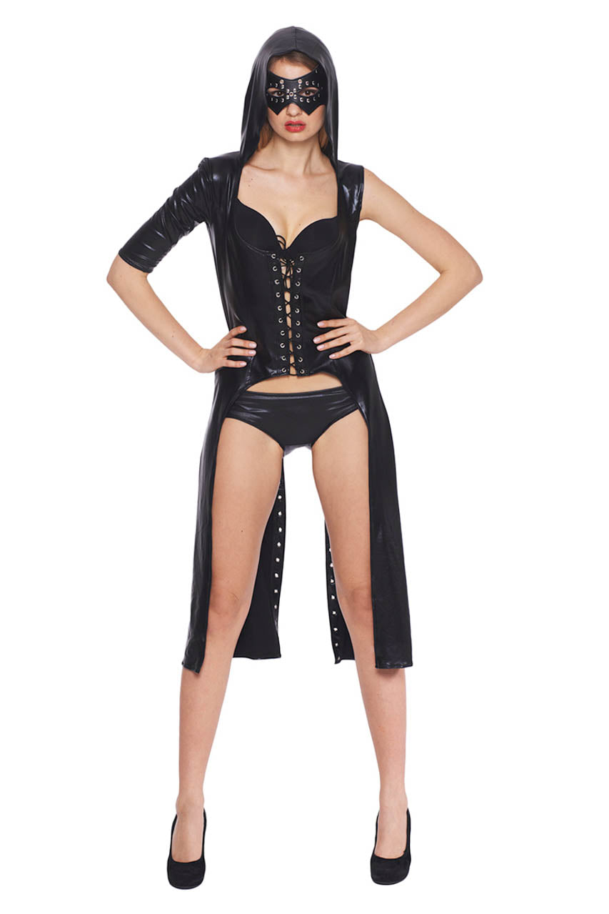 Cette robe simili cuir ouverte devant joue la carte du contraste entre matière rock et silhouette féminine. Le simili cuir noir lisse épouse la taille avant de s’ouvrir en un jupon fluide, créant un effet volanté qui laisse entrevoir les cuisses. Les œillets métalliques soigneusement positionnés apportent une touche industrielle et renforcent la personnalité de ce modèle.