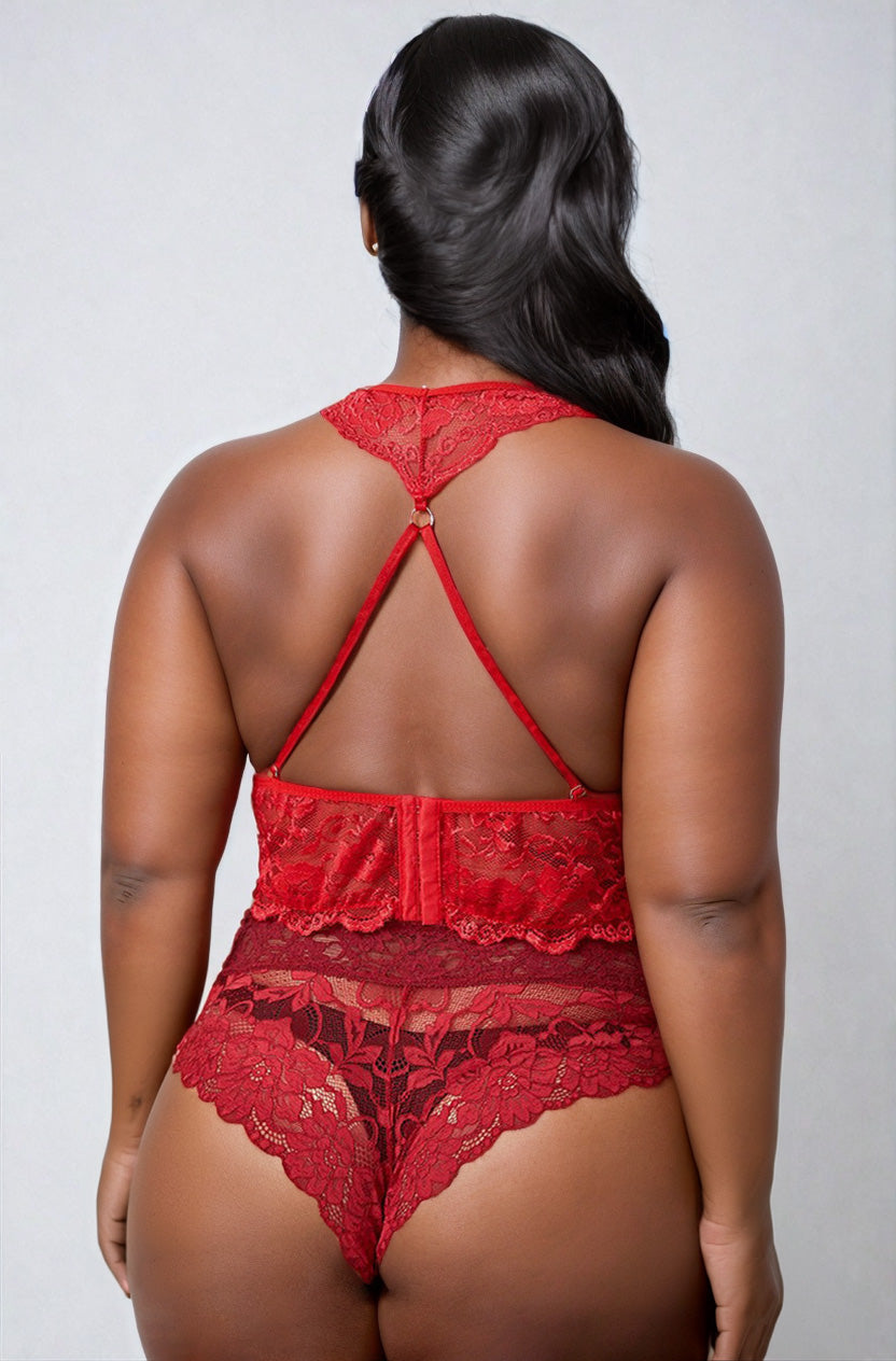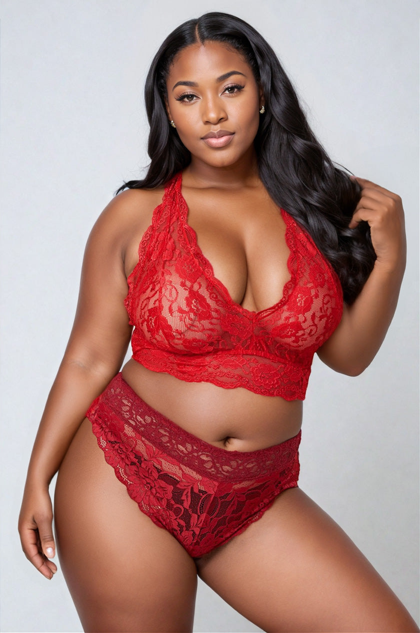 La nuance rouge profonde et les bords festonnés soulignent la silhouette avec raffinement. Cette bralette grande taille en dentelle rouge se porte autant sous un vêtement léger que seule pour un effet lingerie affirmé.