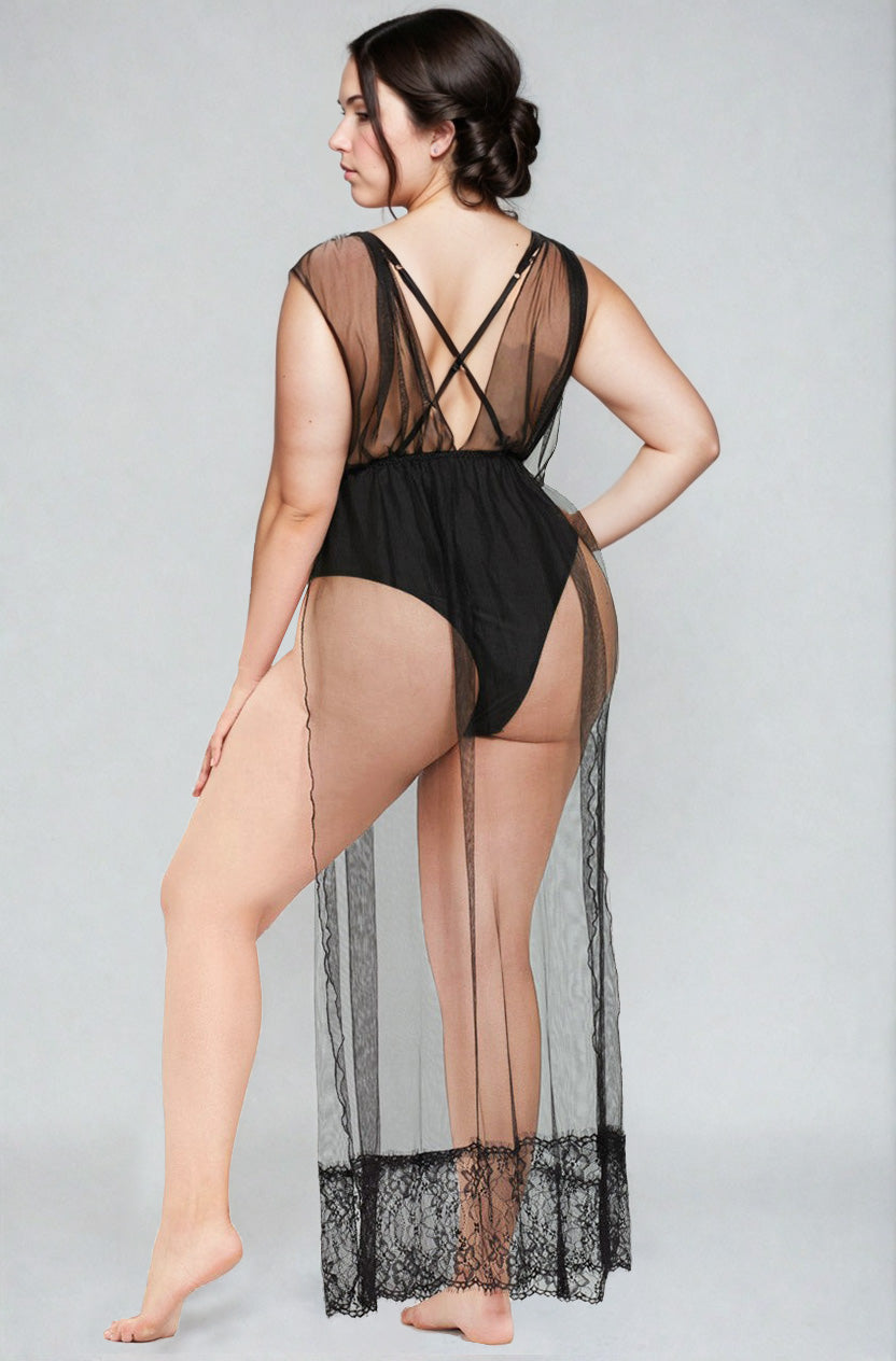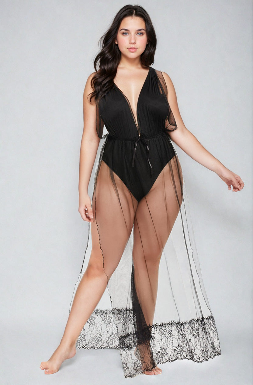 Le Teddy dentelle grande taille et surjupe noire offre une silhouette élancée et confortable jusqu’au 5XL. Son bustier plongeant et sa surjupe en tulle créent un équilibre parfait entre féminité et praticité.