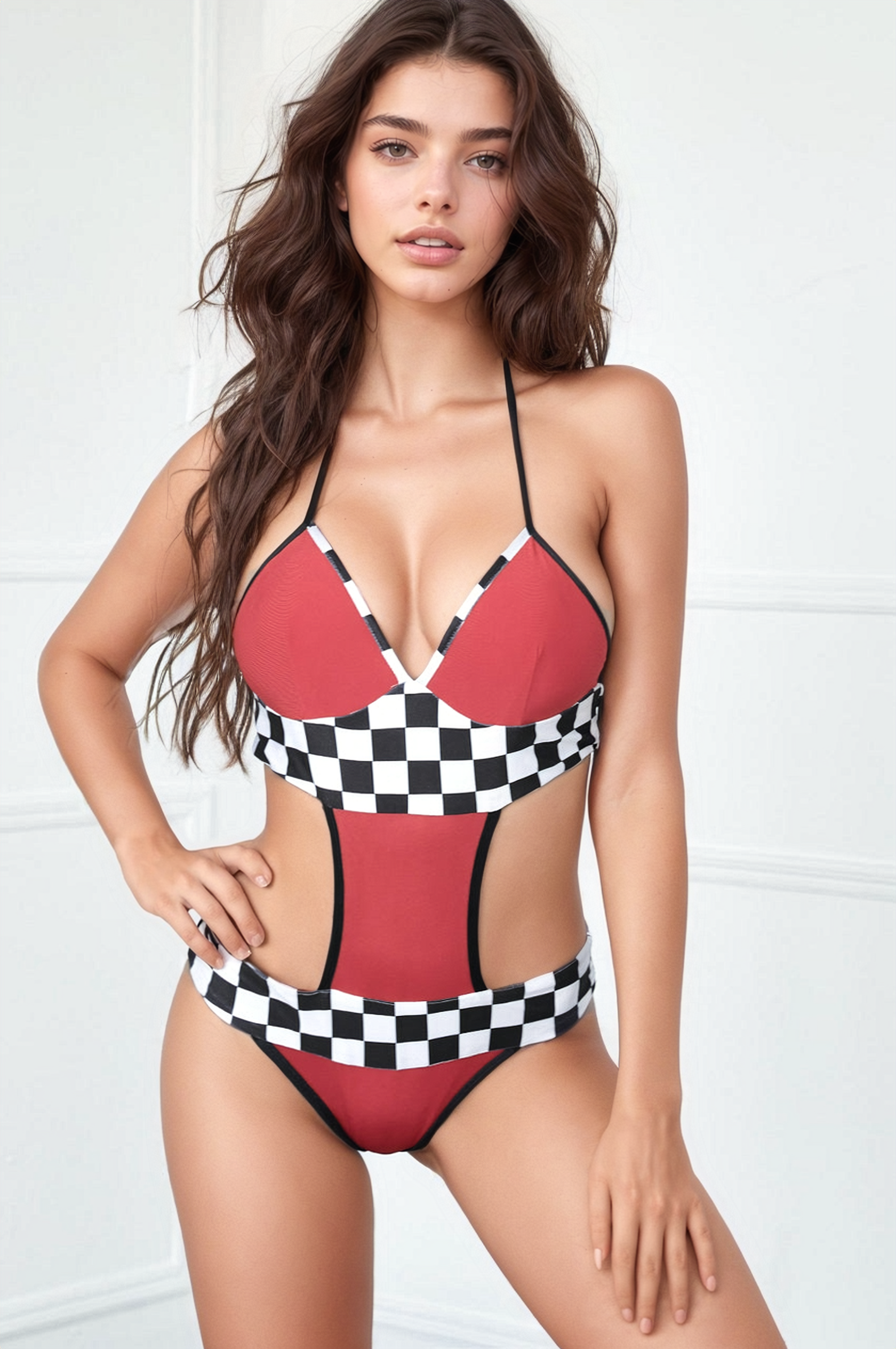 La coupe près du corps souligne la silhouette et le motif à damier noir et blanc évoque la tension du drapeau à damier.
