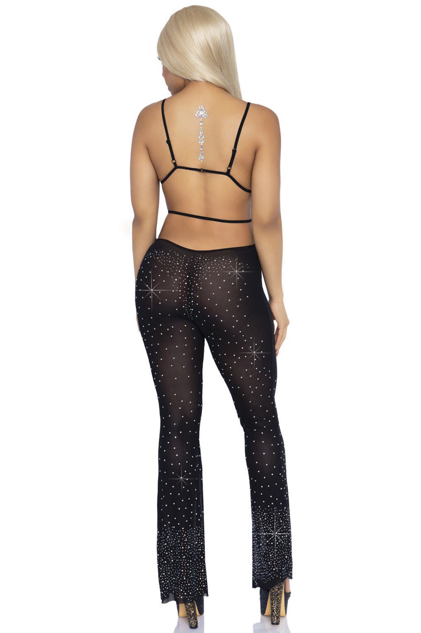 Ce modèle exclusif de top bikini en résille noire à strass et pantalon flare taille haute est importé d’Amérique par des fournisseurs professionnels, disponible uniquement dans notre boutique française.