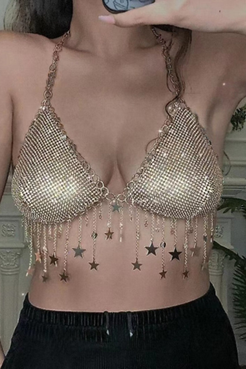 Affichez un style cosmique avec ce Top chaîne et étoiles, alliance de métal poli et de détails scintillants pour magnifier votre silhouette.