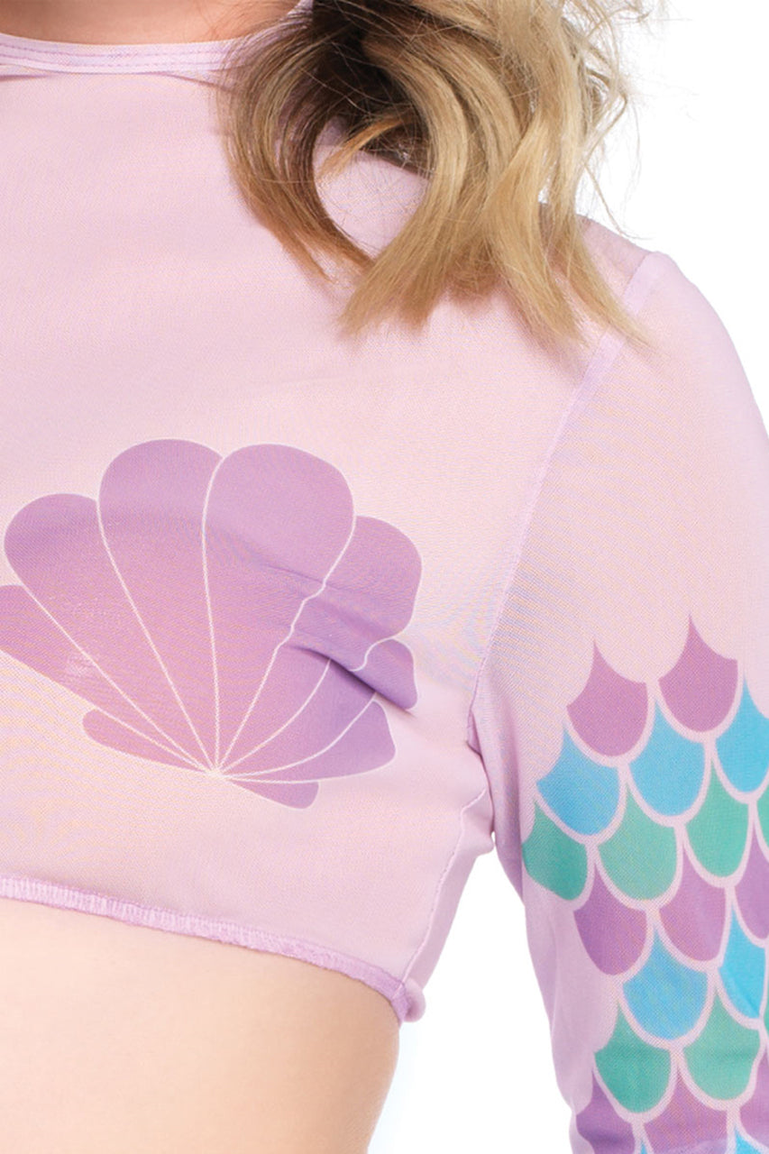 Inspiré des coquillages et des écailles de sirène, ce crop top met en valeur le buste avec sa coupe courte sous la poitrine et son col montant.